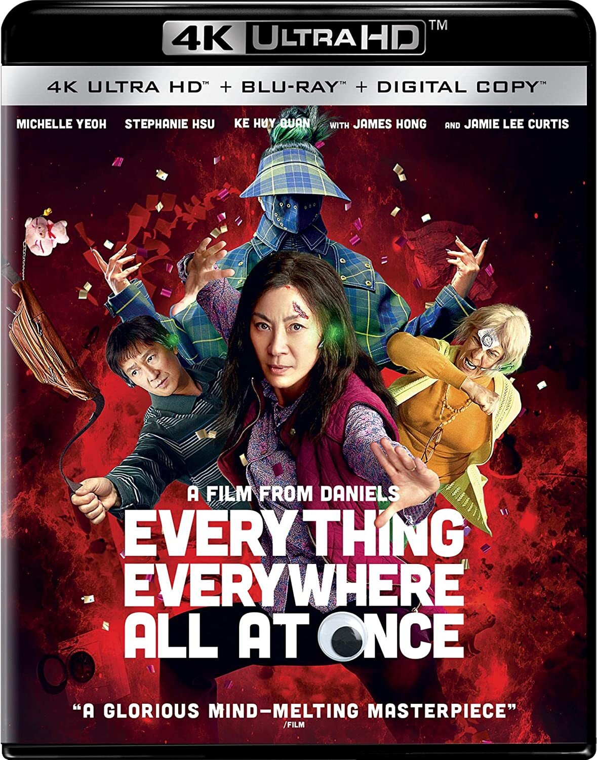 Evelyn Wang (Michelle Yeoh), a flustered immigrant mother, is contacted from a parallel universe and told that only she can save the world. The unlikely hero must learn to channel her newfound powers and fight through the splintering timelines of the multiverse to save her home, her family, and herself in this big-hearted and irreverent adventure. With Stephanie Hsu, Ke Huy Quan, Jenny Slate, Harry Shum Jr., James Hong, and Jamie Lee Curtis.