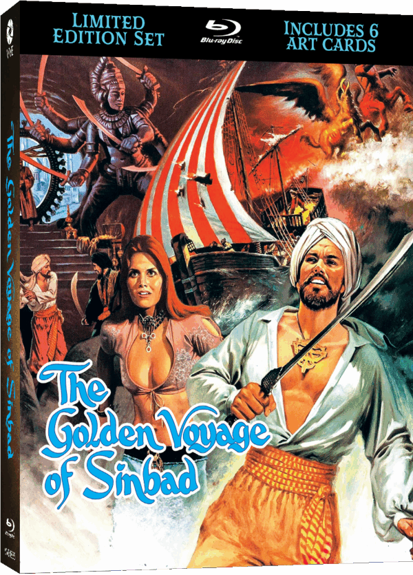 Sinbad (John Phillip Law), Prince of Baghdad and legendary sailor, finds an intriguing map and sets sail for the previously uncharted island of Lemuria with a beautiful slave girl, Margiana (Caroline Munro), and the Grand Vizier of the land of Marabia. Prince Koura (Tom Baker), an evil wizard who is trying to gain control of malevolent spirits, follows in an effort to thwart Sinbad’s quest. Sinbad reaches Lemuria in spite of an enchantment Koura casts upon the giant figurehead of Sinbad’s ship which brings it to life. On Lemuria, Sinbad and his stalwart crew encounter a six-armed, sword-brandishing statue, a one-eyed centaur and a griffin. Finally, Sinbad confronts Koura in a face-to-face duel to the death!
