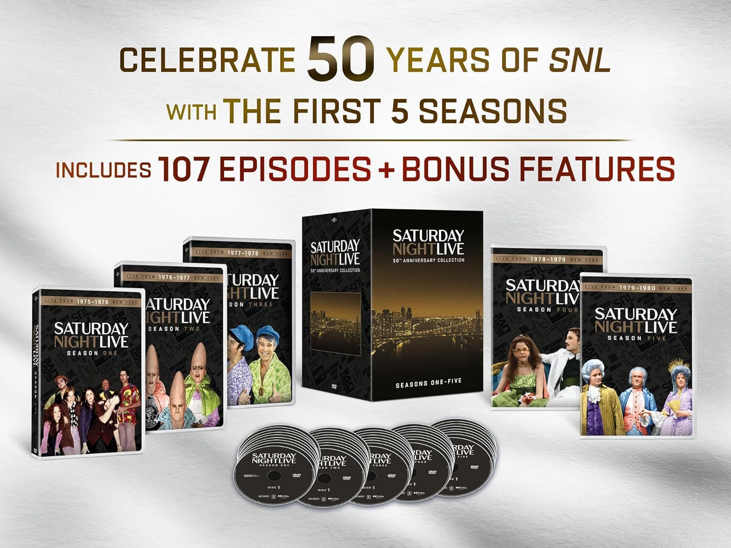 Since its launch 50 years ago in 1975, Saturday Night Live has been the destination for generation after generation of groundbreaking comedic performers. The show has launched the careers of numerous comedy legends, including Chevy Chase, Bill Murray,Gilda Radner, Dan Aykroyd, John Belushi, and many more. Through the years, the ever-evolving cast has kept a finger firmly on the pulse of the times. From pop culture parodies to political satire, Saturday Night Live: 50th Anniversary Collection includes the first five seasons with countless unforgettable characters and catchphrases, while playing host to some of the biggest names in entertainment, sports, music, and politics.