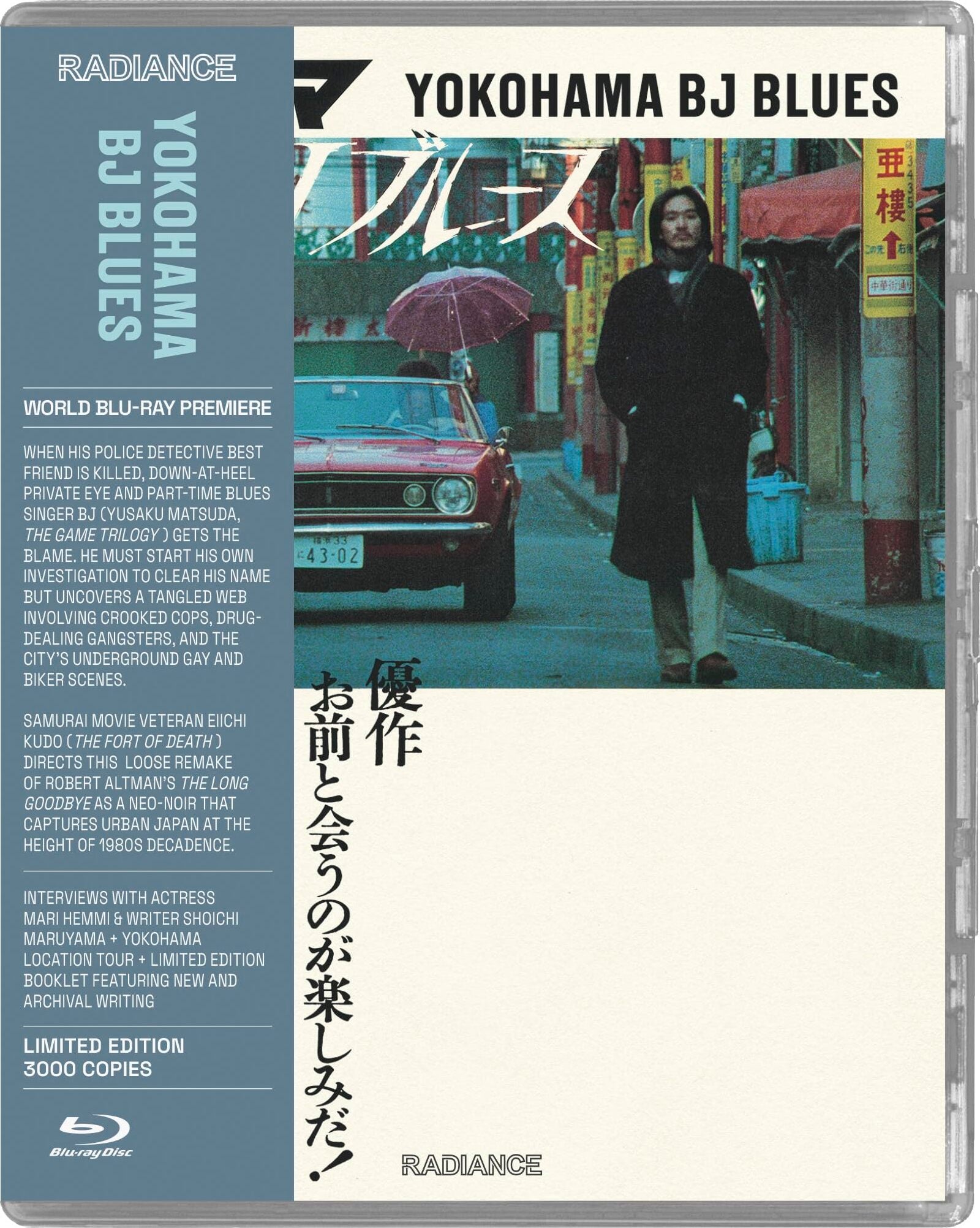 When his police detective best friend is killed, down-at-heel private eye and part-time blues singer BJ (Yusaku Matsuda, The Game Trilogy) gets the blame. He must start his own investigation to clear his name, but what he uncovers is a tangled web involving crooked cops, drug-dealing gangsters, the city's underground gay and biker scenes, and even his own past. A loose remake of Robert Altman's The Long Goodbye that also draws from Visconti's Death in Venice, this was Matsuda's break with his action hero image. Samurai movie veteran Eiichi Kudo (The Fort of Death) relishes his chance at directing a neo-noir that captures urban Japan at the height of 1980s decadence.